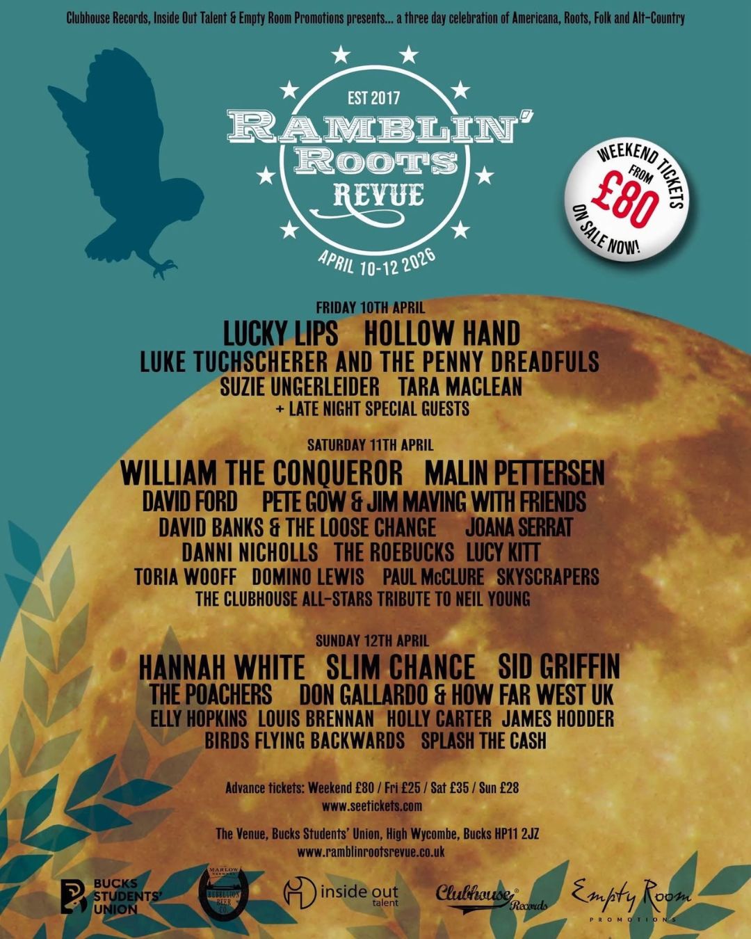 ๐ถ Headliners include Hannah White, William the Conqueror, Lucky Lips, Slim Chance & Sid Griffin